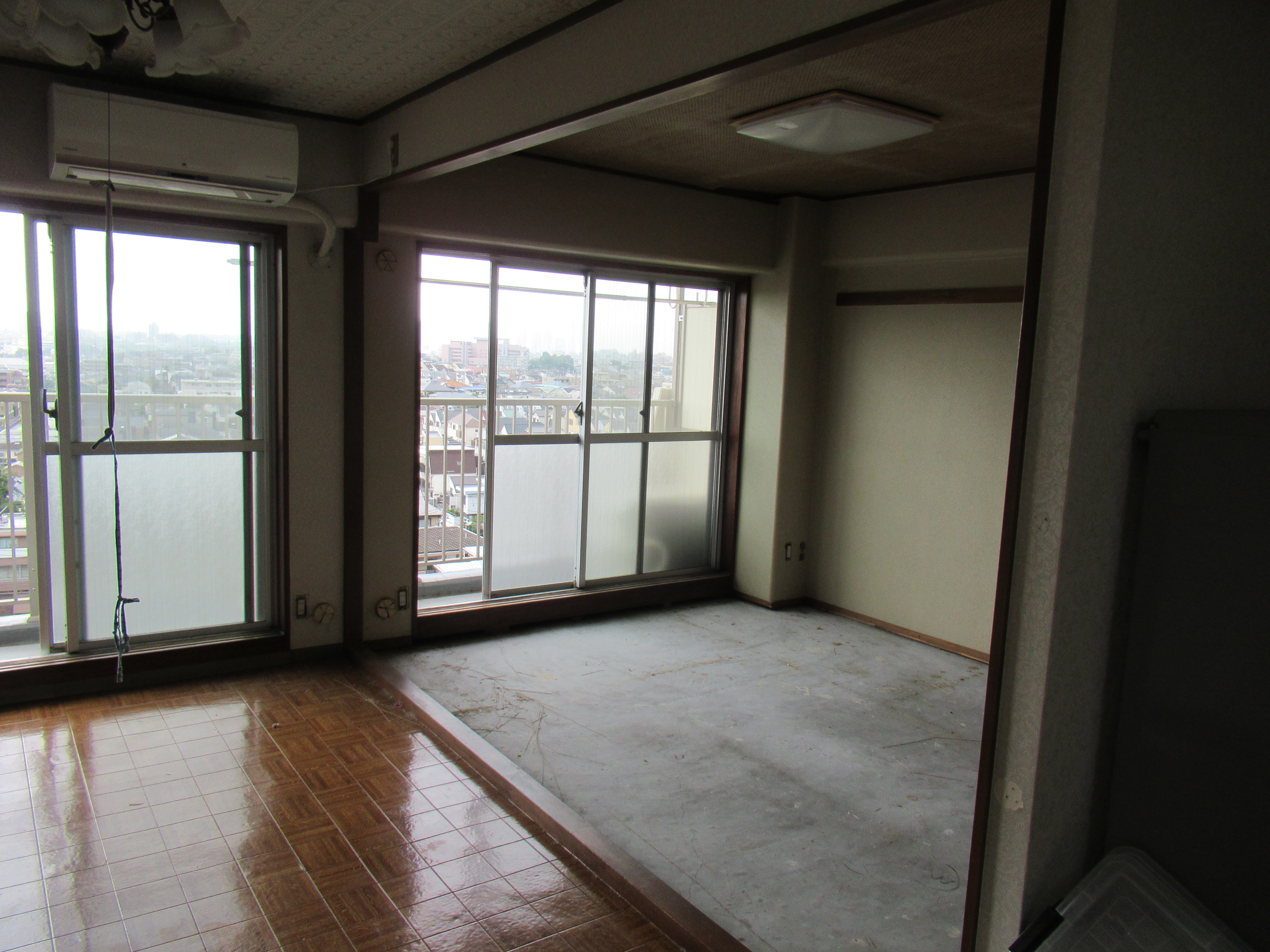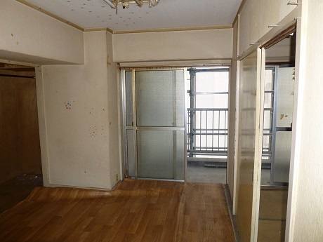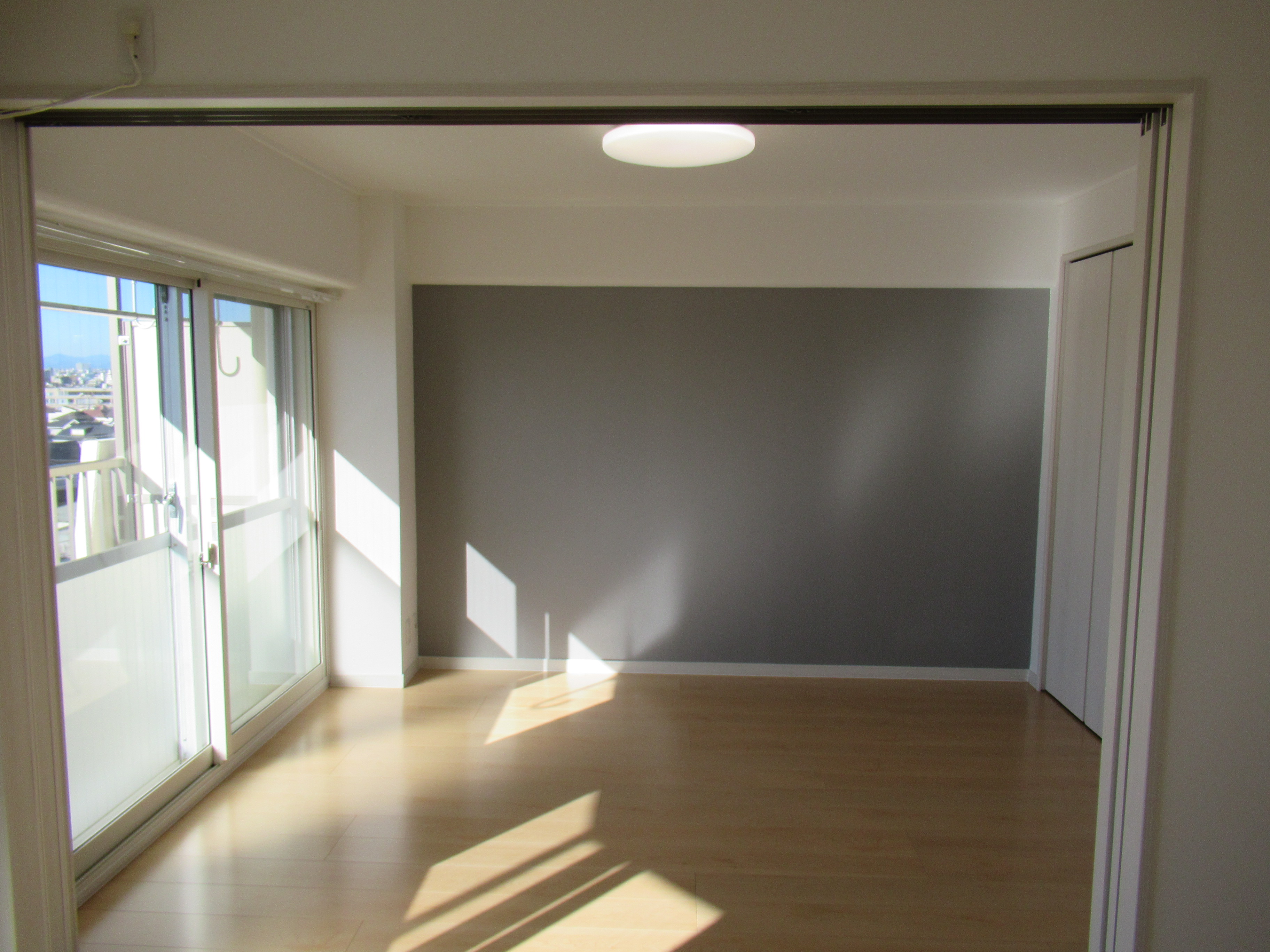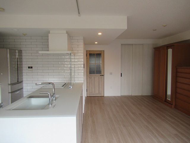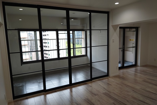 築年数の古いマンションを購入されたので、フルリフォームのご依頼を頂きました。和室だった部屋は間取りを変更し、広いLDKの洋室へ変更しました。サンルームになる部屋とリビングの間仕切りは、引き違いのガラス扉にすることで部屋の奥まで光が届き、明るい空間になります。