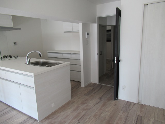 水回りの出入り口に段差があったため、段差を解消するリフォームをしました。キッチンもL型キッチンからI型キッチンへ変更し、すっきりとした印象になりました。もともと和室だった部屋は洋間に変更し、出入り口から見える壁はアクセントカラーの壁紙を貼っています。