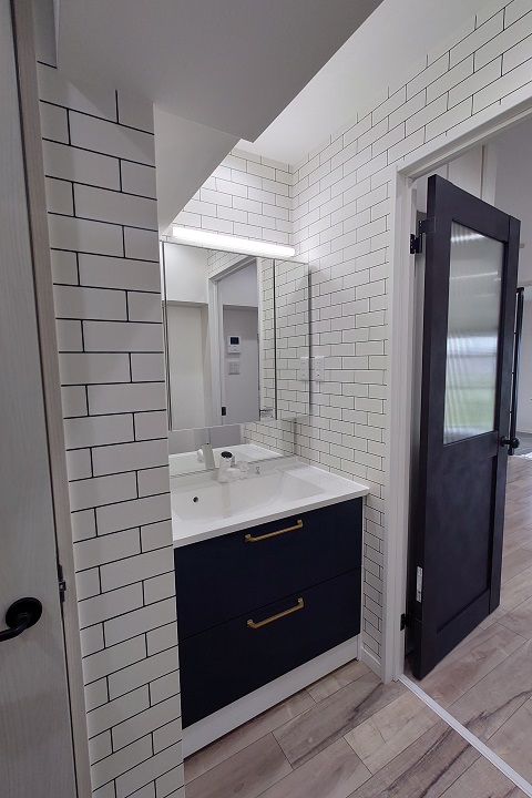 セミオープンのL型キッチンを対面式キッチンに変更。リビングに入ると左側に和室がありましたが、壁を壊し広々とした リビングへと変わりました。キッチンの壁やトイレ・洗面所の壁にはお客様こだわりのタイルを貼ることで、素敵な空間に変わりました。