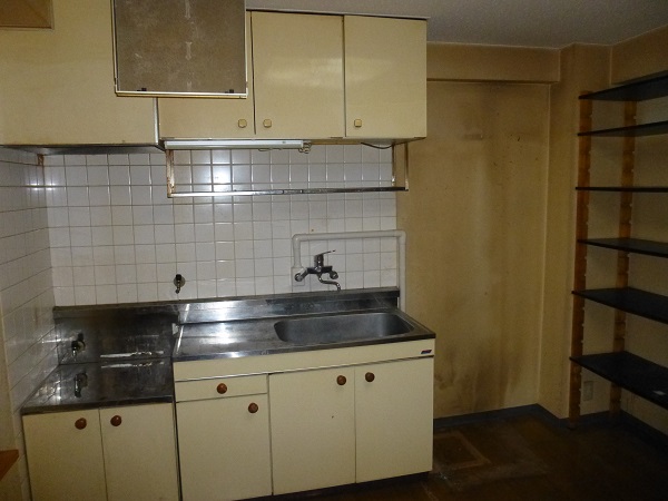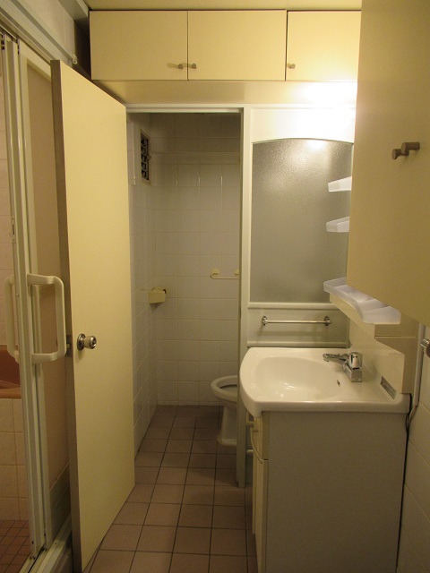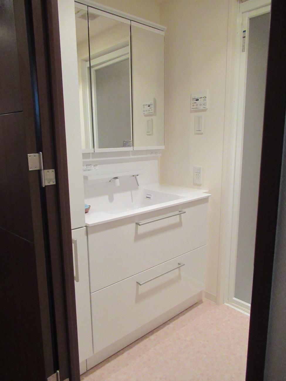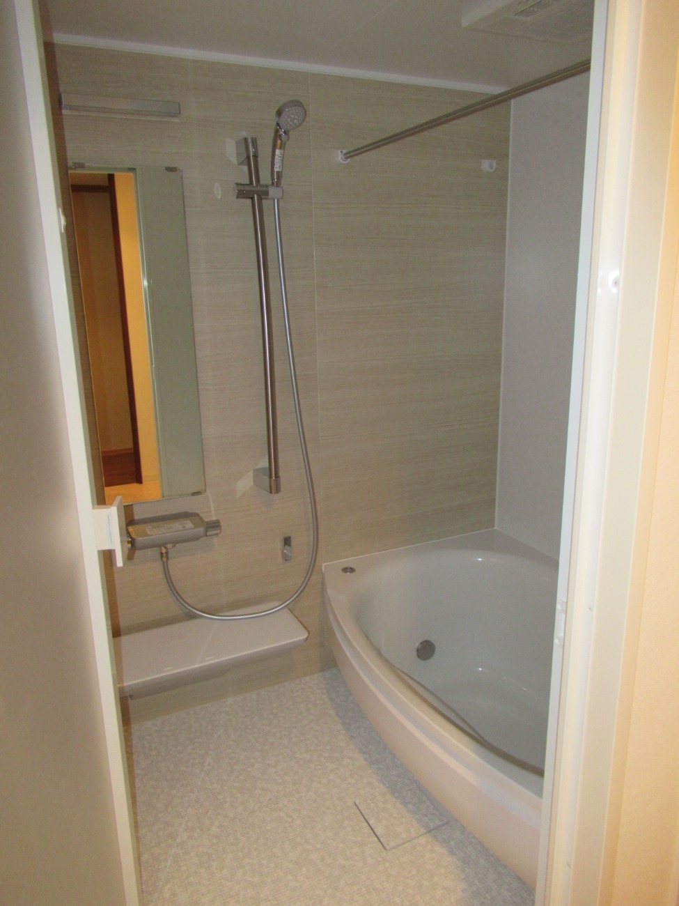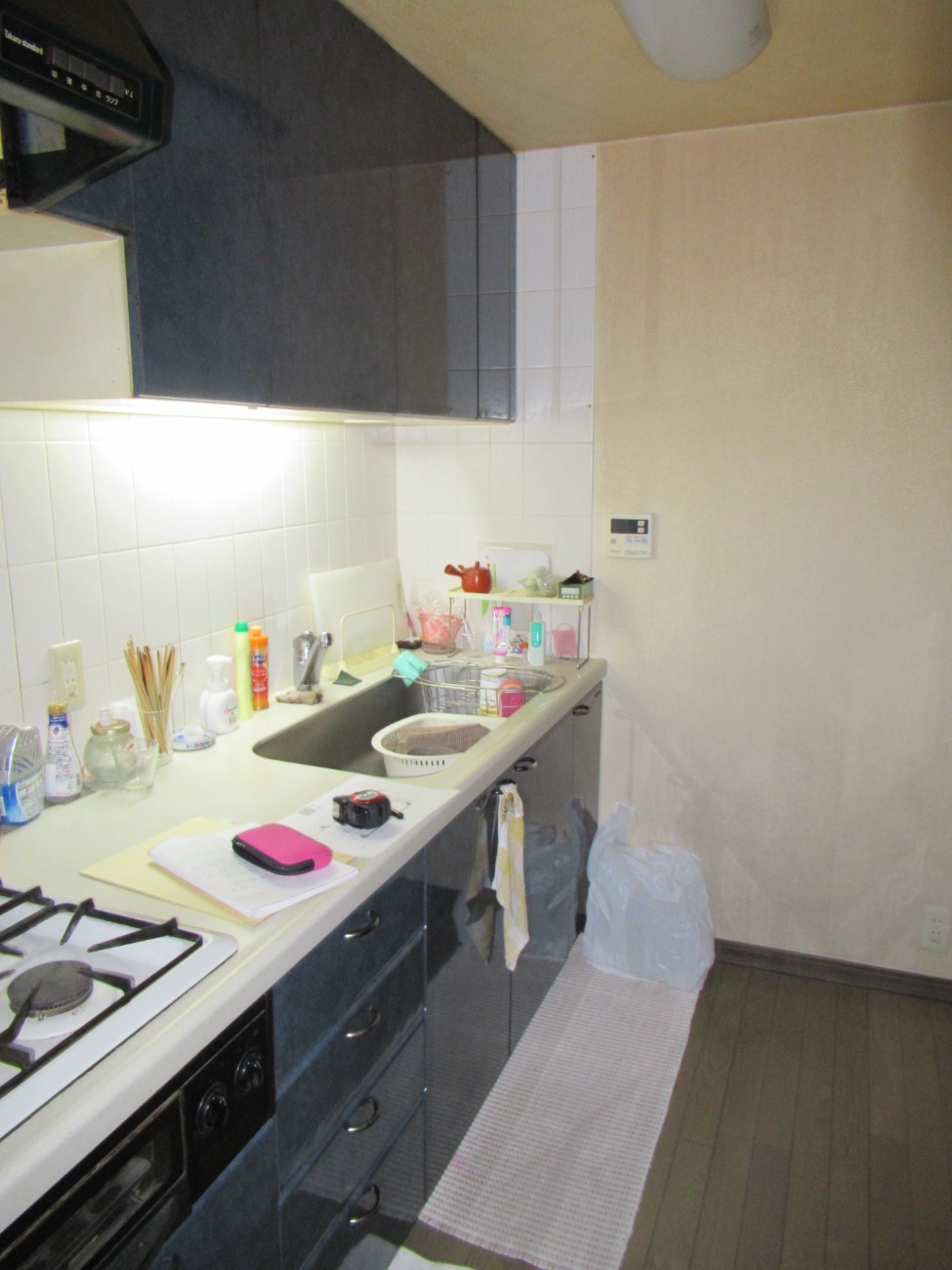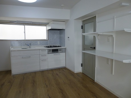 築45年のマンションのリノベーションです。浴室は、タイルからユニットへ交換し、トイレは別にしました。トイレ設置には押入れ部分を利用したので、収納スペースを確保するため、下に収納庫がついたベットスペースを作りました。キッチンも収納を増やすため、可動式の収納棚を設置しました。