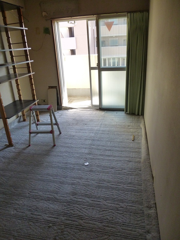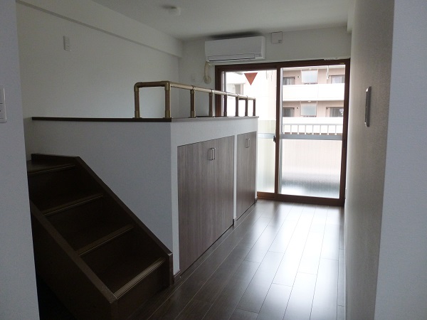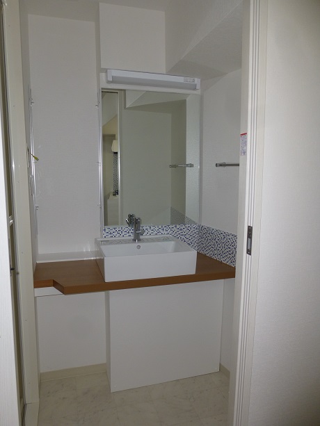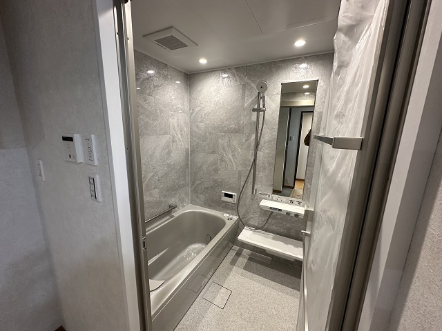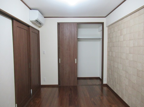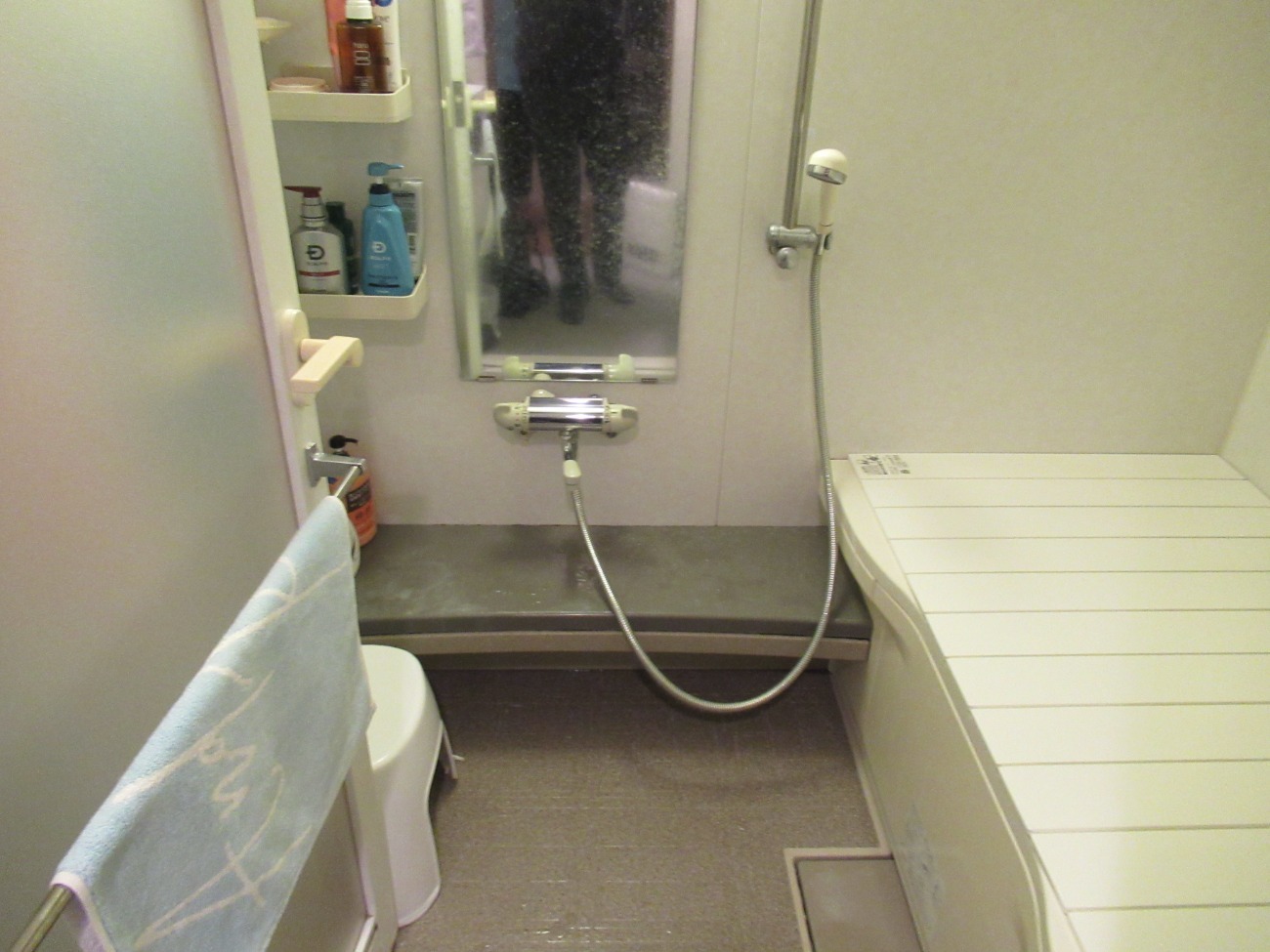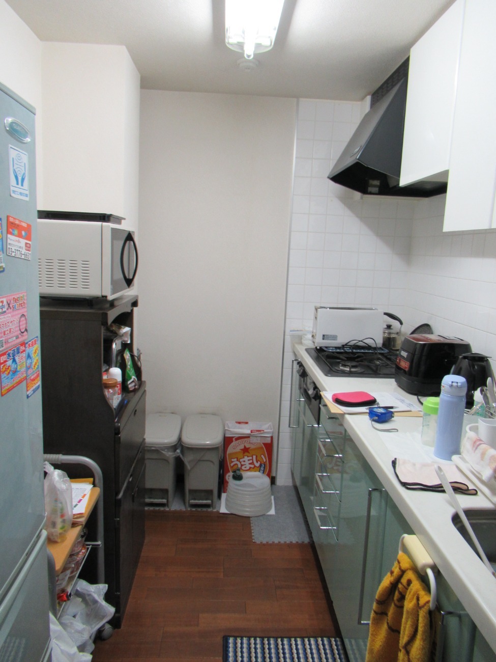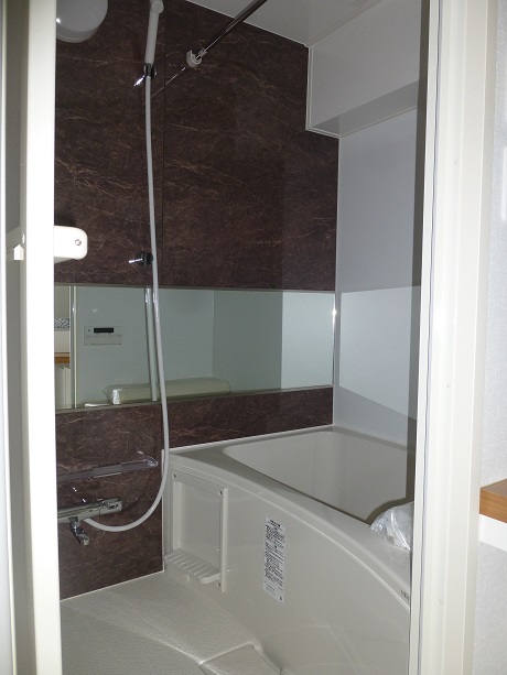 築45年のマンションのリノベーションです。浴室は、タイルからユニットへ交換し、トイレは別にしました。トイレ設置には押入れ部分を利用したので、収納スペースを確保するため、下に収納庫がついたベットスペースを作りました。キッチンも収納を増やすため、可動式の収納棚を設置しました。
