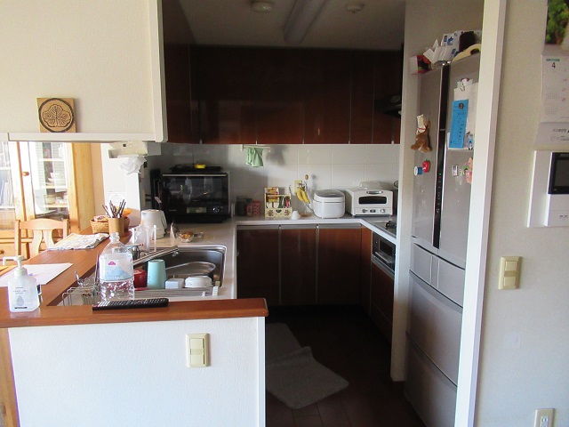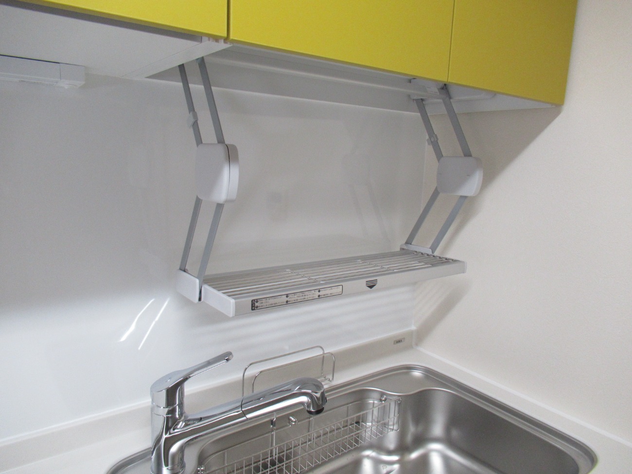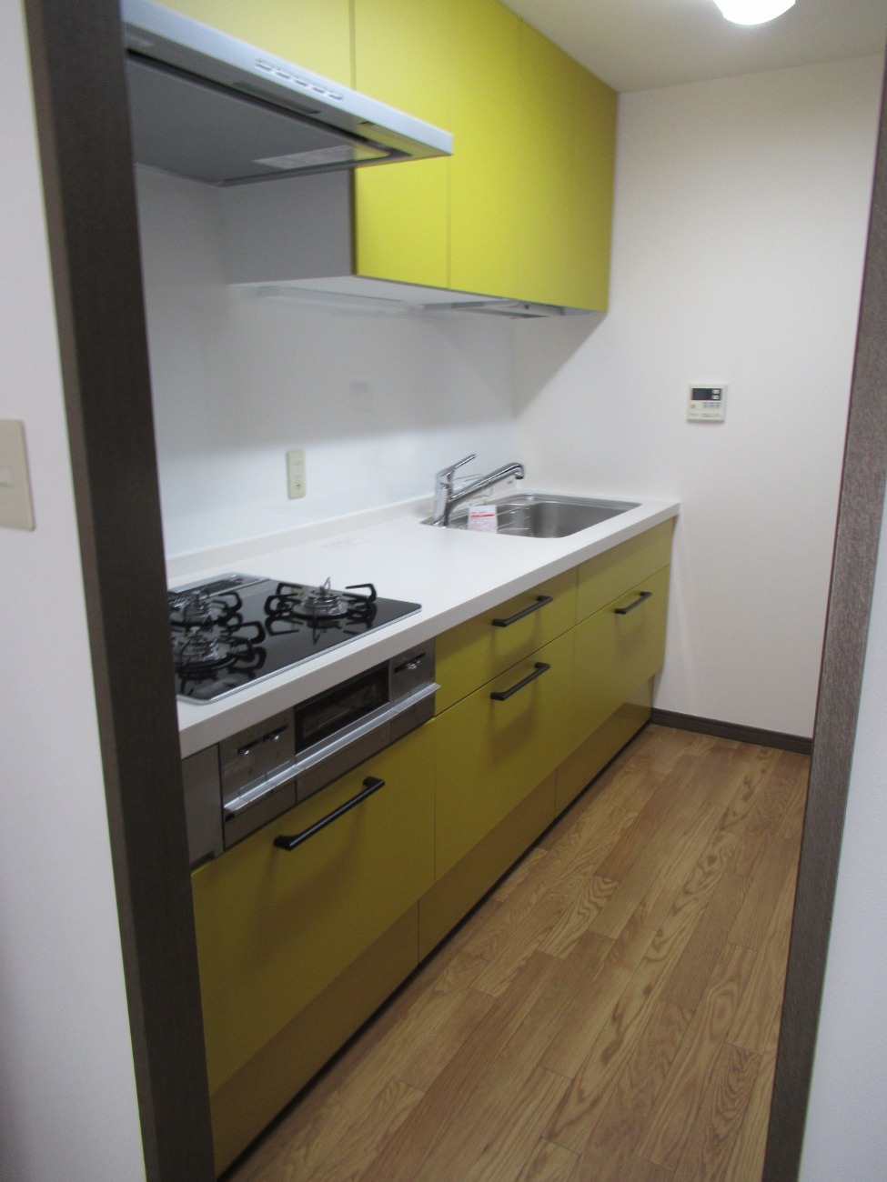 お部屋全体のリフォームを承りましたが、特にキッチンは明るく・使い勝手の良いものをご希望されていたので、シンク上の吊戸棚には、調理中必要な時は降ろして、使わないときはしまえる昇降式の水切り棚をつけました。キッチンのお色はお客様がお選びになりましたが、ビビットカラーのイエローは明るく、壁で囲まれたキッチンですが、華やかで素敵でした。