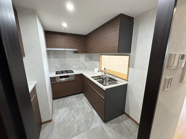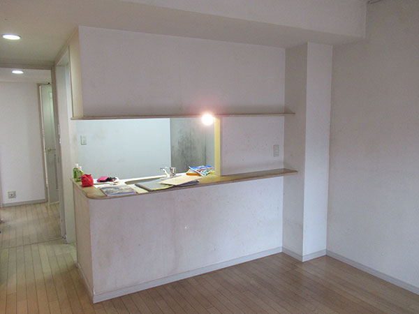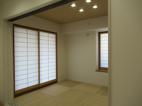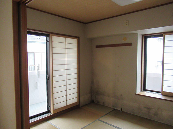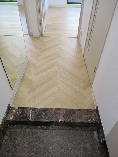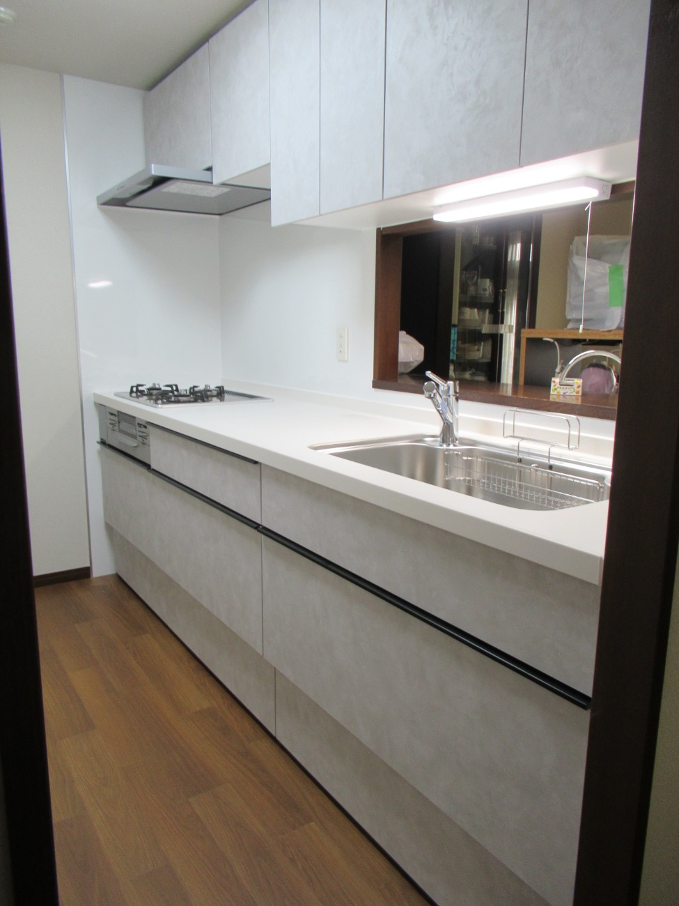 中古マンションをご購入されたので、全面リフォームのご依頼を頂きました。カビが多く発生していた窓際の壁は、防かび処理を施し、壁紙をすべて張り替えました。リビング続きの和室は、フローリングと同色の琉球畳を使用し、一体感のある仕上げになっています。キッチンはセミオープンだった壁を撤去して、対面式に変更。廊下はヘンリボーンフローリングに張替をして、居室とは違う雰囲気になっています。