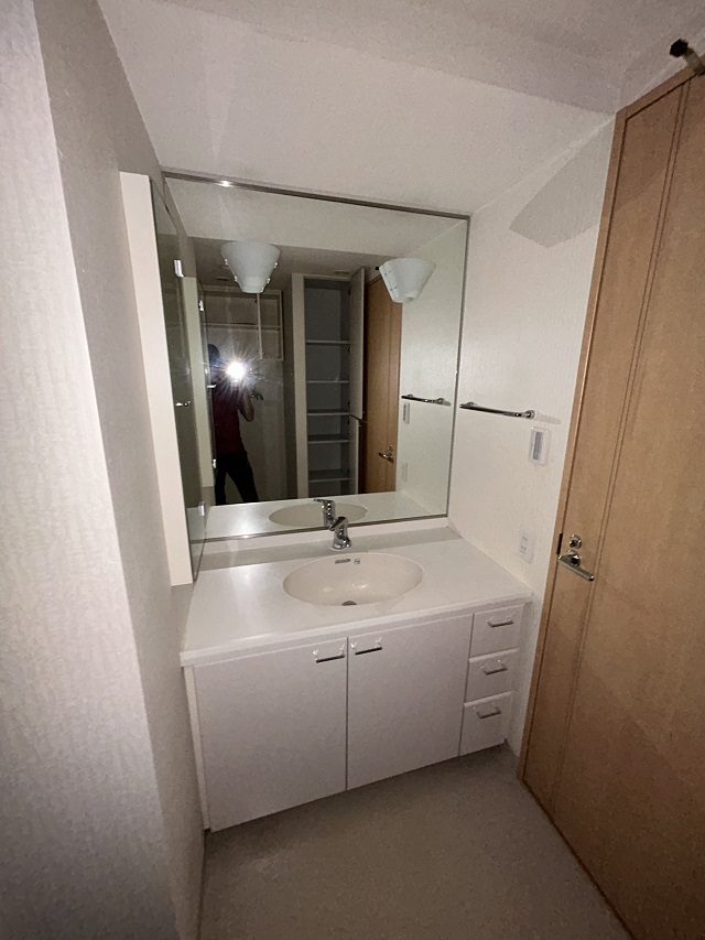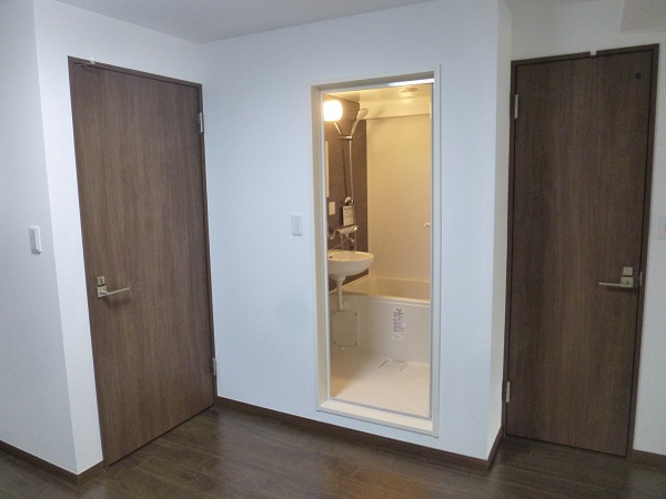 2DKから1LDKへ間取りの変更です。壁や収納を撤去して大型テレビがおけるスペースを確保しました。 浴室に中にあった洗面スペースもそれぞれ独立させて、使いやすくしました。